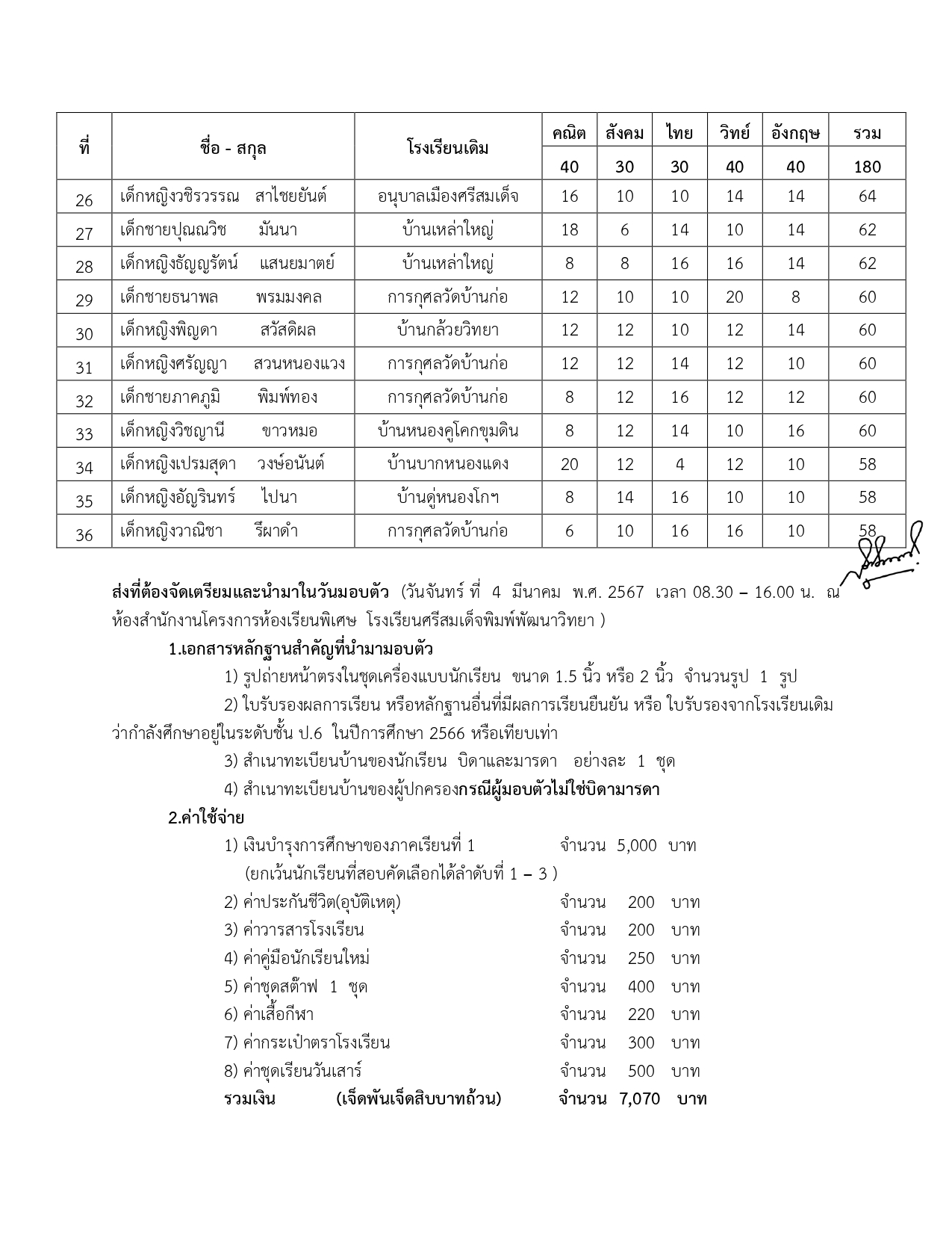 ประกาศโรงเรียนศรีสมเด็จพิมพ์พัฒนาวิทยา เรื่อง รายชื่อนักเรียนที่มีสิทธิ์เข้าศึกษาต่อระดับชั้นมัธยมศึกษาปีที่ ๑ ห้องเรียนพิเศษ ประเภทสอบคัดเลือก ประจำปีการศึกษา ๒๕๖๗