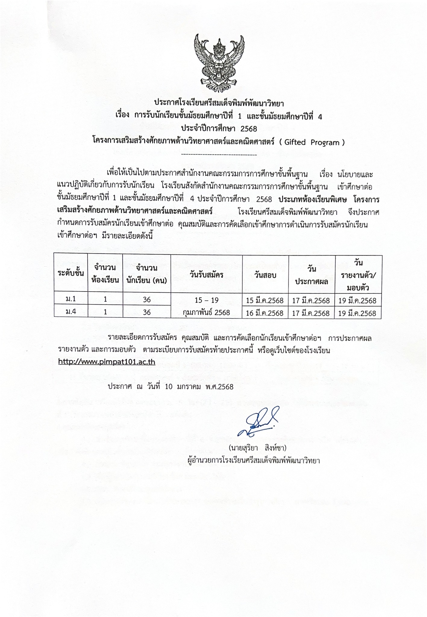 ประกาศโรงเรียนศรีสมเด็จพิมพ์พัฒนาวิทยา เรื่องการรับสมัคร ม.1 ม.4 โครงการห้องเรียนพิเศษ GP ประจำปีการศึกษา 2568