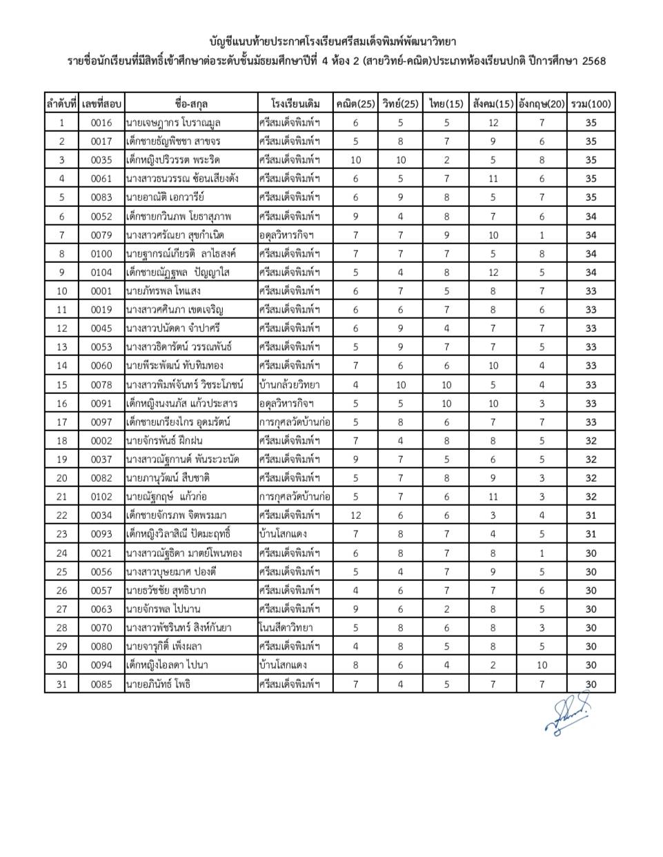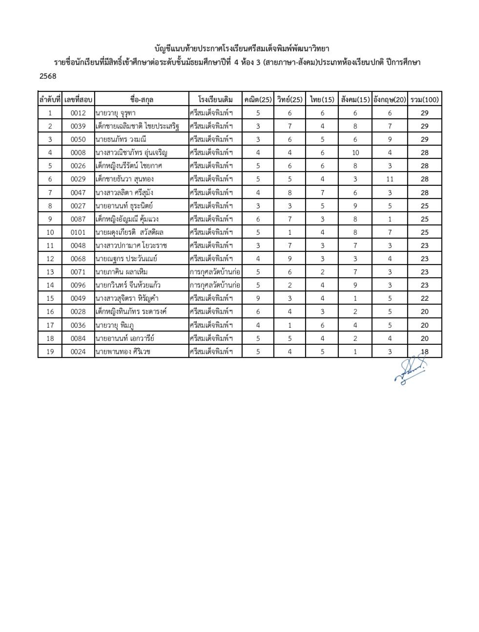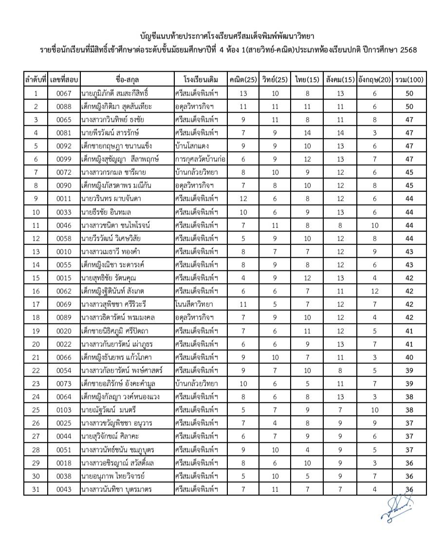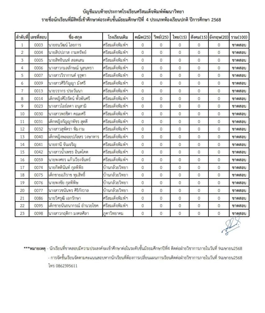 ประกาศโรงเรียนศรีสมเด็จพิมพ์พัฒนาวิทยาเรื่อง รายชื่อนักเรียนที่มีสิทธิ์เข้าศึกษาต่อชั้นมัธยมศึกษาปีที่ 4 ประเภทห้องเรียนปกติ