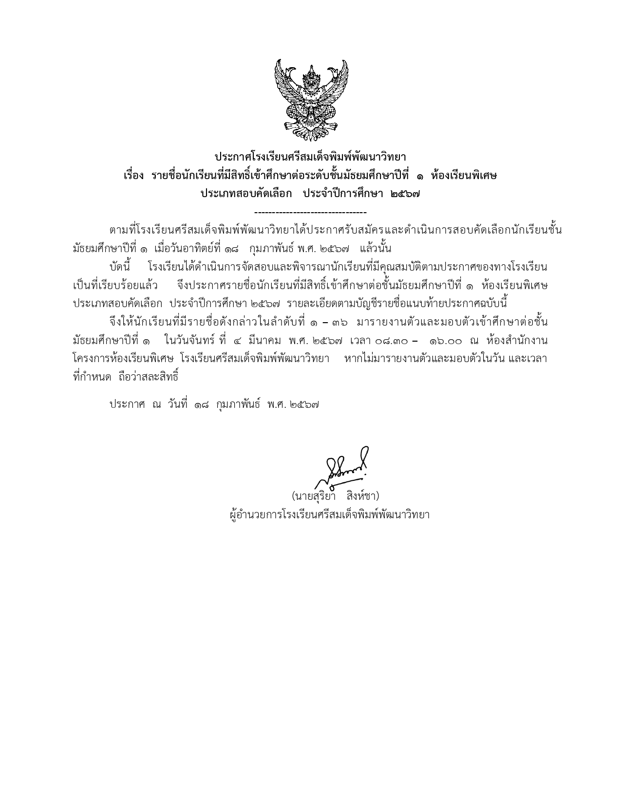 ประกาศโรงเรียนศรีสมเด็จพิมพ์พัฒนาวิทยา เรื่อง รายชื่อนักเรียนที่มีสิทธิ์เข้าศึกษาต่อระดับชั้นมัธยมศึกษาปีที่ ๑ ห้องเรียนพิเศษ ประเภทสอบคัดเลือก ประจำปีการศึกษา ๒๕๖๗