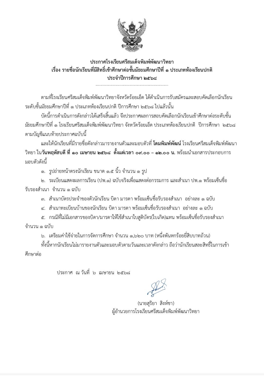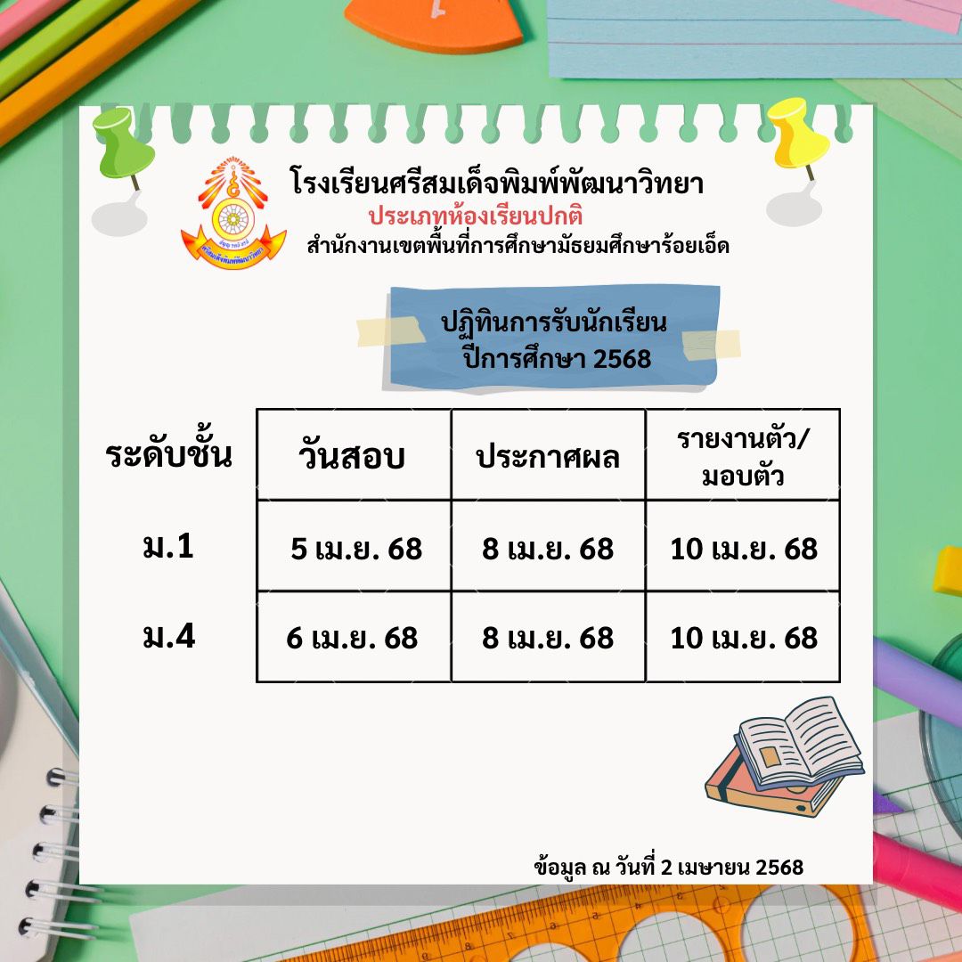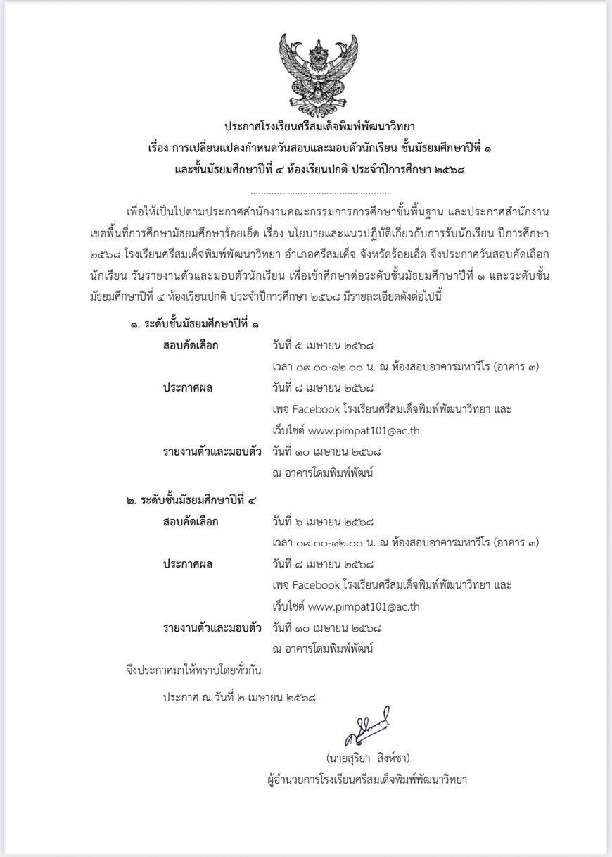 ประกาศโรงเรียนศรีสมเด็จพิมพ์พัฒนาวิทยา เรื่อง การเปลี่ยนแปลงกำหนดวันสอบและมอบตัวนักเรียน ม.1 และ ม.4 ห้องเรียนปกติ ประจำปีการศึกษา 2568