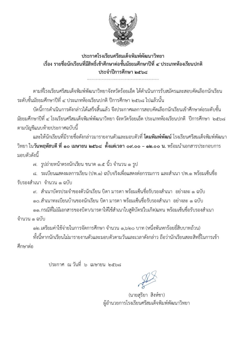 ประกาศโรงเรียนศรีสมเด็จพิมพ์พัฒนาวิทยา