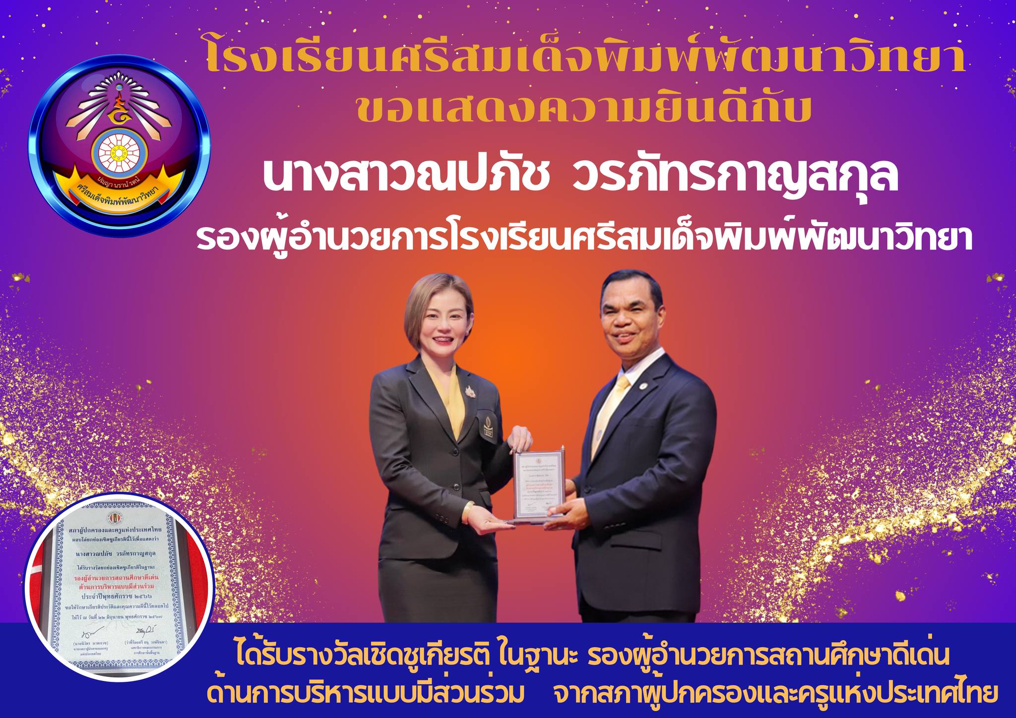 โรงเรียนศรีสมเด็จพิมพ์พัฒนาวิทยา ขอแสดงความยินดีกับ นางสาวณปภัช วรภัทรกาญสกุล รองผู้อำนวยการโรงเรียนศรีสมเด็จพิมพ์พัฒนาวิทยา ได้รับรางวัลเชิดชูเกียรติ ในฐานะ รองผู้อำนวยการสถานศึกษาดีเด่น ด้านการบริหารแบบมีส่วนร่วม จากสภาผู้ปกครองและครูแห่งประเทศไทย