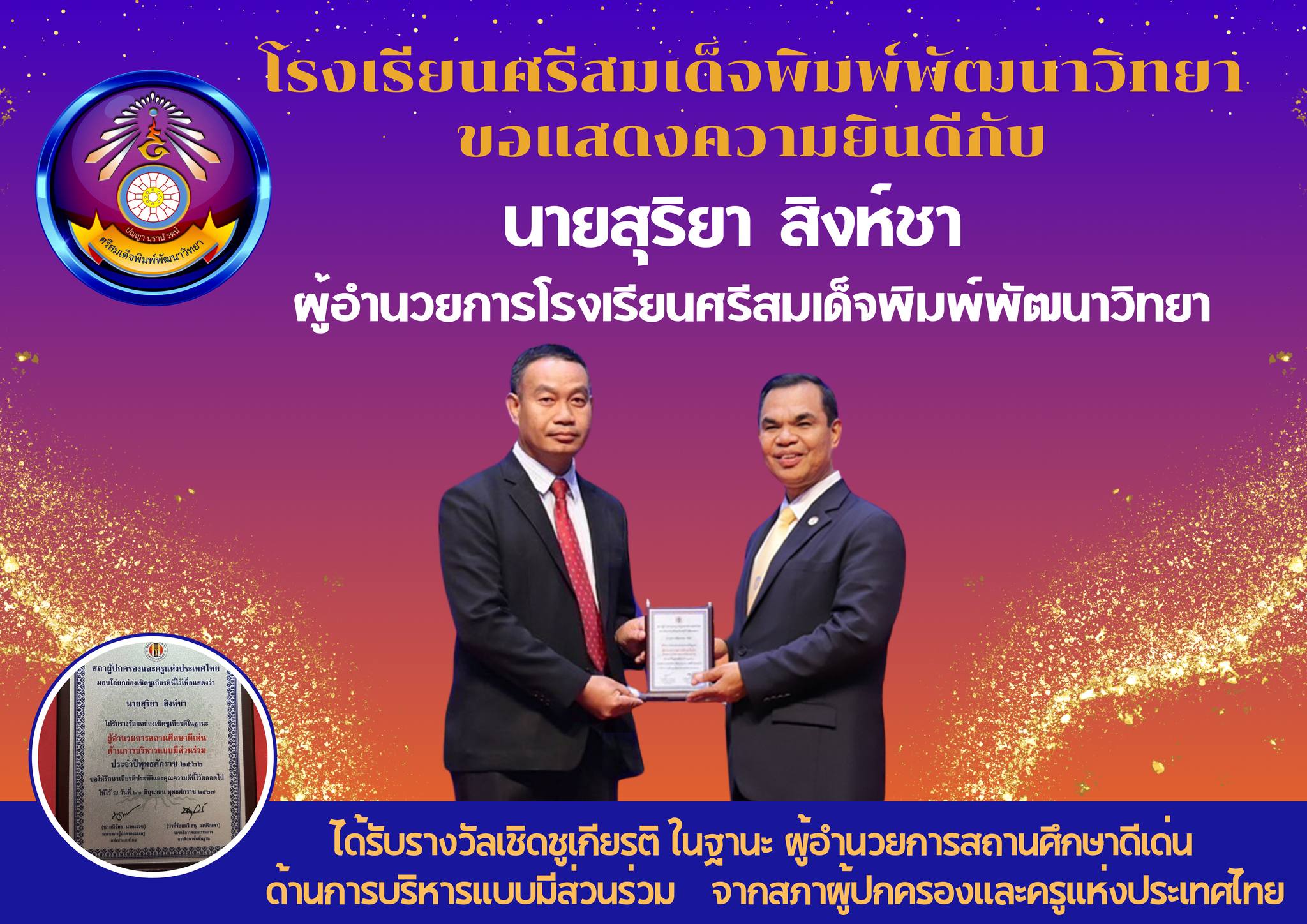 โรงเรียนศรีสมเด็จพิมพ์พัฒนาวิทยา ขอแสดงความยินดีกับ นายสุริยา สิงห์ชา ผู้อำนวยการโรงเรียนศรีสมเด็จพิมพ์พัฒนาวิทยา ได้รับรางวัลเชิดชูเกียรติ ในฐานะ ผู้อำนวยการสถานศึกษาดีเด่น ด้านการบริหารแบบมีส่วนร่วม จากสภาผู้ปกครองและครูแห่งประเทศไทย
